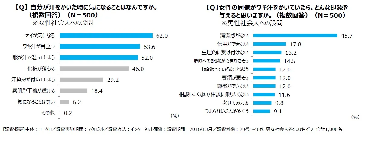 年間を通じて、世界中のあらゆるシーズン、あらゆる人の肌に究極の心地よさを提供するLifeWear『エアリズム』を販売するユニクロは、2016年に実施した『インナー着用と印象に関する調査』より、女性社会人のワキ汗に対する意識を発表します。