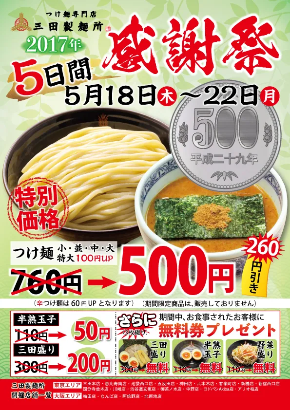 期間中は、「つけ麺」の並(200g)・中(300g)・大(400g)を500円で提供します。同時にトッピングの人気メニューをお得な価格で提供いたします。「三田盛り」300円→200円、「半熟玉子」110円→50円。