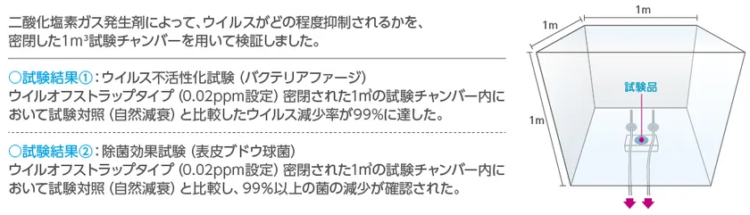 二酸化塩素ガス発生剤によって、ウイルスがどの程度抑制されるかを密閉した1m3試験チャンバーを用いて検証しました。