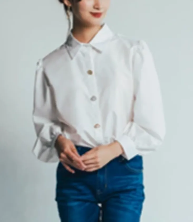 内田理央も塩野瑛久も注目!「シンプルだけど素敵♪」 異なるデザインのビジューボタンがお洒落な ランタンスリーブシャツ! TOKYO FM「Qoo10 presents 内田理央の明日、なに着よ?」